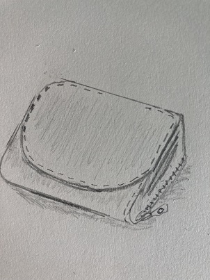 Je suis vigilante aussi à poser les ombres en dessous du porte monnaie. Donc j'accentue le trait du dessous du porte monnaie et je pose quelques hachures tout autour du porte monnaie.