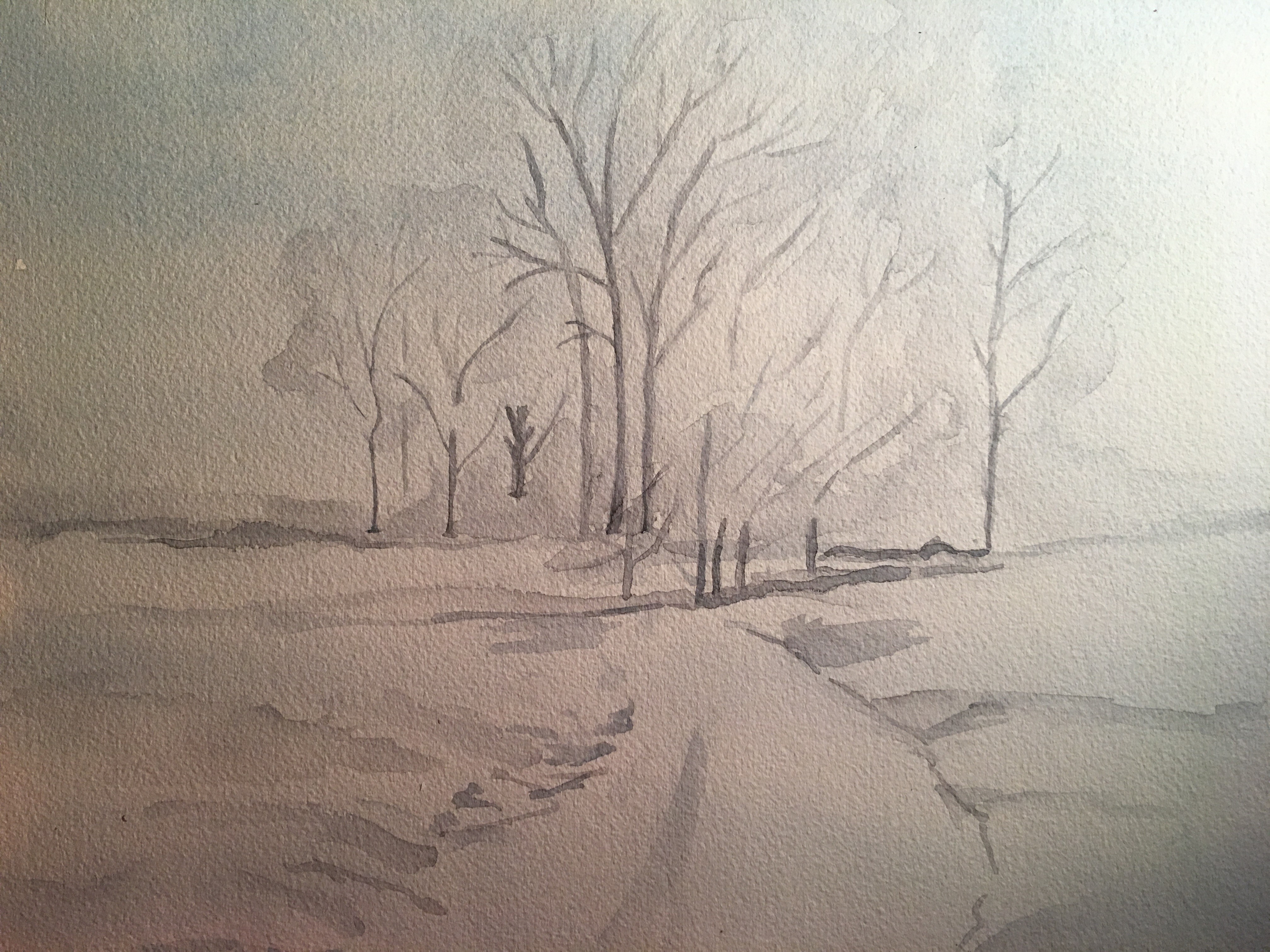 Je prends le temps de dessiner les branchages morts avec mon mélange dilué car il me sera plus facile de foncer que d’effacer.
