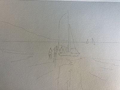 Maintenant, tu peux suggérer le bord de l'eau avec un trait un peu ovale comme l'image ci dessous.Ce simple geste suffit à poser la perspective du paysage.