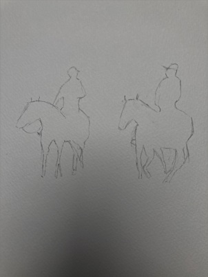 - Le dessin des chevaux et des cavaliers est très rapide, juste la forme générale de l'ensemble.